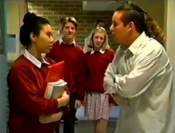 Inside, a guy opens his locker and bean bag beans pour out onto the floor. Anne, Lance and Amy are singing Toadie's praises. They go into the classroom and Toadie squirts Lance's trousers with a water pistol. Lance is not amused. Anne wonders if it's safe to go outside and Amy sends Lance. Toadie squirts him again in the face. Susan appears and tells Toadie to clean up the water. Another locker is opened and more bean bag beans pour out, leaving Susan looking exasperated. She enters the classroom and Lance complains about Toadie squirting him. Susan says she's not enjoying this day either but they all have to suffer through it so he'll just have to go and dry himself off.