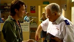 Isabelle swans in asks if Dylan has seen Stingray - he's late for his shift. Erm, Scotty? The one sitting over the other side of the store? No, no, he hasn't seen him, he's probably studying. Isabelle calls Stingray who answers his phone and talks real quiet in the hope he won't be noticed; he tells Izzy he's stuck in traffic, but she spots him and tells him to go to work.