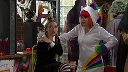 Tyler is giving Ben and Elly a hand setting up while Piper (as Wednesday Addams) sits watching them. Angus eventually arrives and receives Elly's wrath a) for complimenting her on her costume and b) for not being here already to help set up. She is also quick to remind him that she's here to supervise not participate when Angus mentioned he'd something planned for her. Tyler isn't amused to find that Angus is busy chatting some other girl (Bec) up rather than helping set up or indeed talking to Piper (other than brief hello) who is sitting there like a bit of a prune!