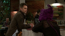 Tyler can't hold back from having a go at Angus for chatting up Bec in front of Piper. "Get out of my face," Angus tells him after making it clear that he's not with Piper, that them sleeping together was a one-off. Tyler picks up his stuff and leaves, so Piper rushes over to find out what that was about and Angus puts it down to Aaron telling him about them. Piper explains she was the one that told him so Angus deduces that Tyler is jealous.